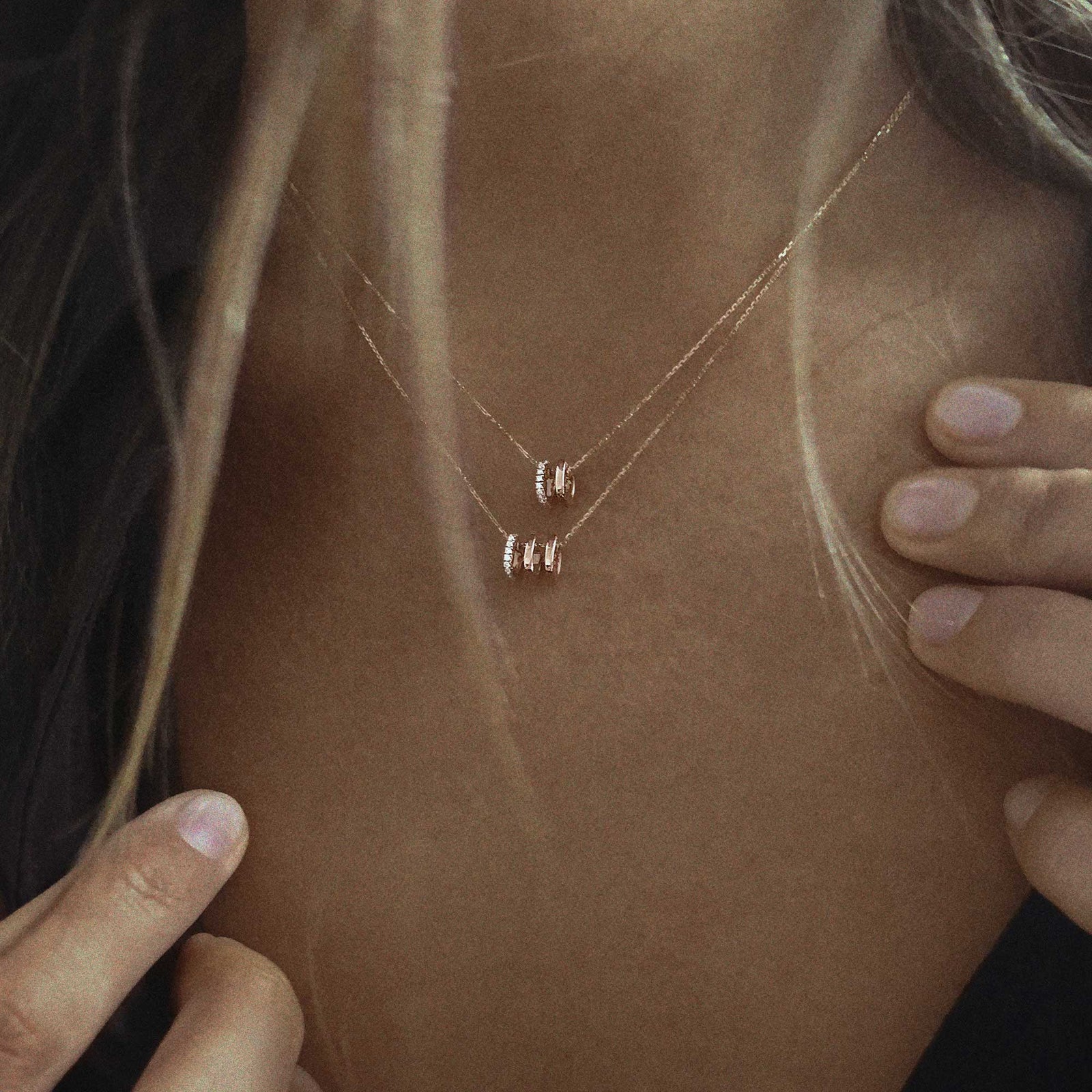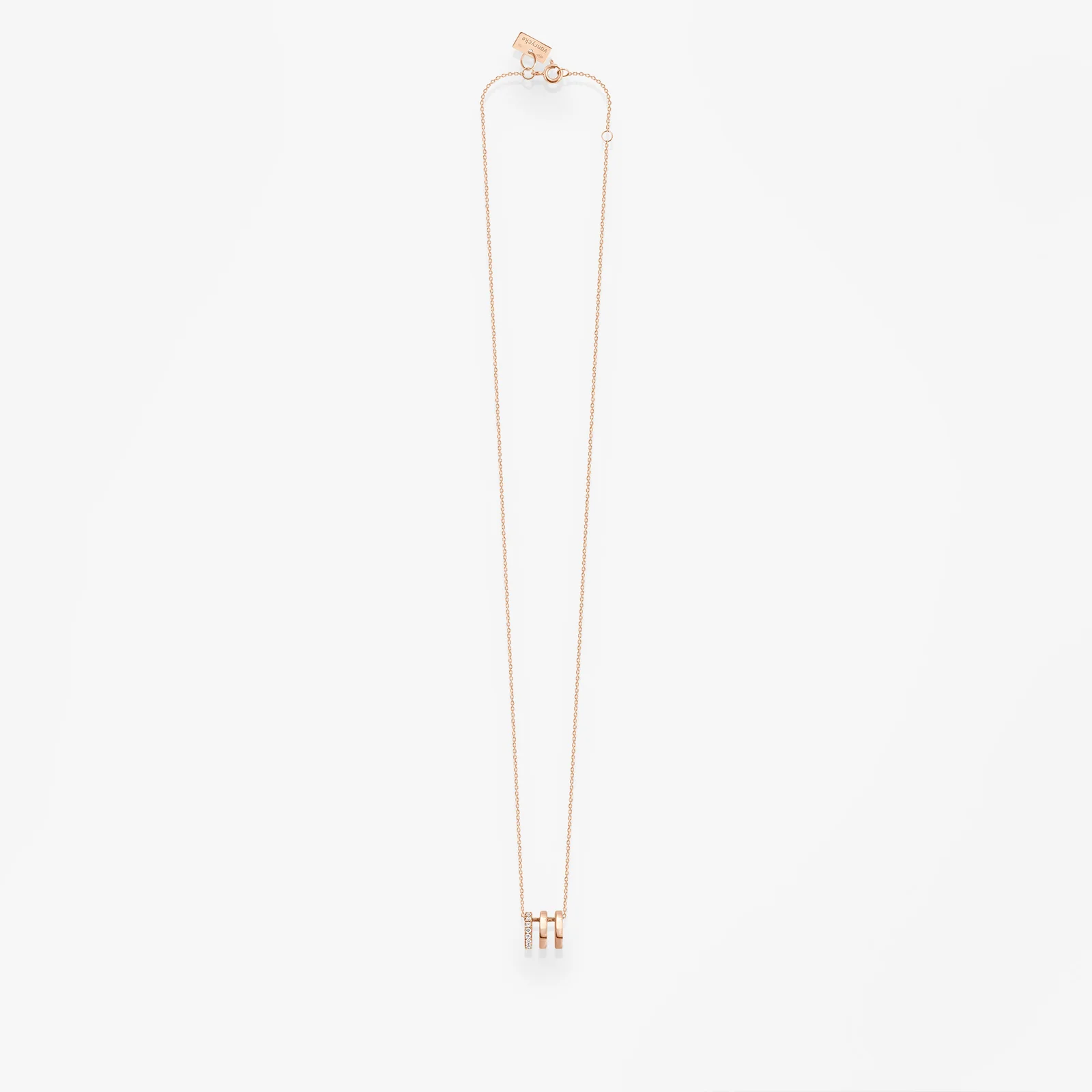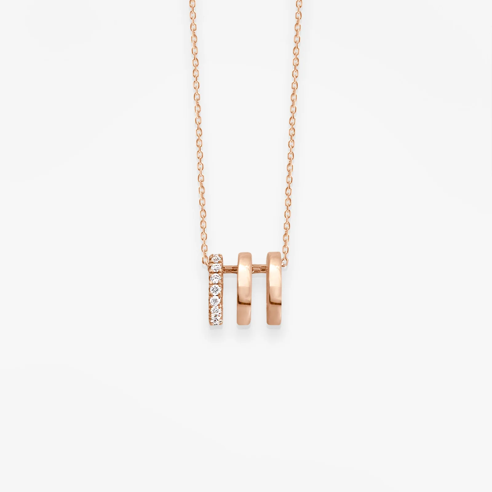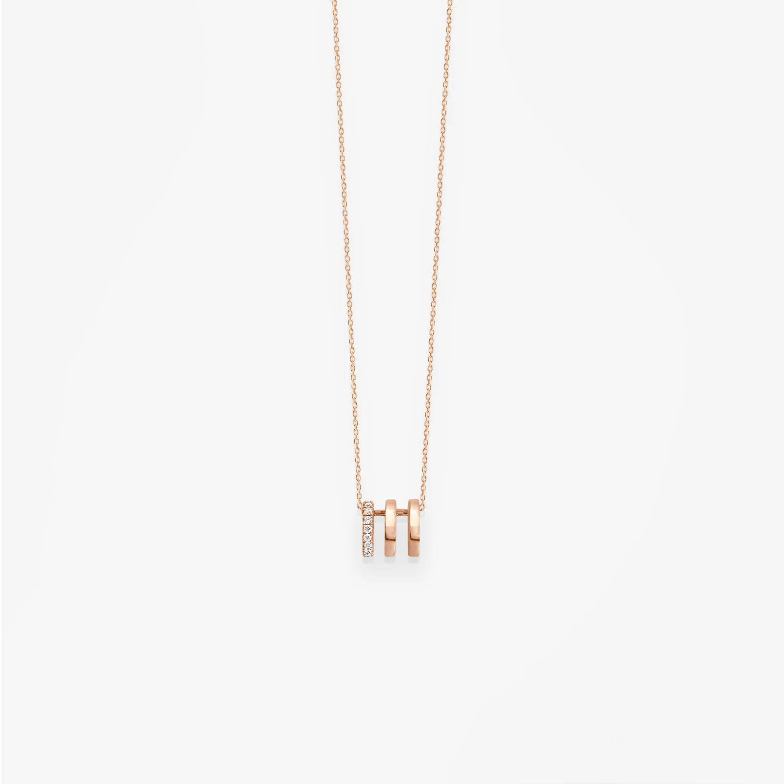 Ce collier à porter au quotidien orné d’un triple anneau d’or 18k et de diamants glissera librement le long de sa fine chaîne diamantée.